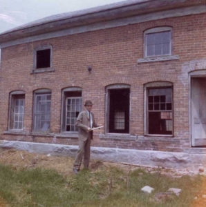 Pittsfield architect Terry Hallock during the reconstruction of the Brick Poultry House, 1962